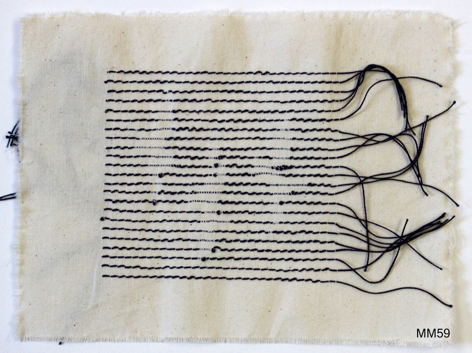 The next two samples (MM73 and 75) follow from that suggestion and my previous design work, Module 1, Image 292. A slice of this image was ripped, oiled and scrunched as was a piece of copy paper. This was laminated onto Anthropologie tissue (I'm sure I'm not the only person who gets more excited by the wrapping of a parcel than the contents) using acrylic wax. MM72 shows the background made for sample MM73. When both samples were stitched they still looked a little stark in places so a gave them a rub with a Koh-i-Noor Graphite Stick to highlight the ridges in the paper and tissue.